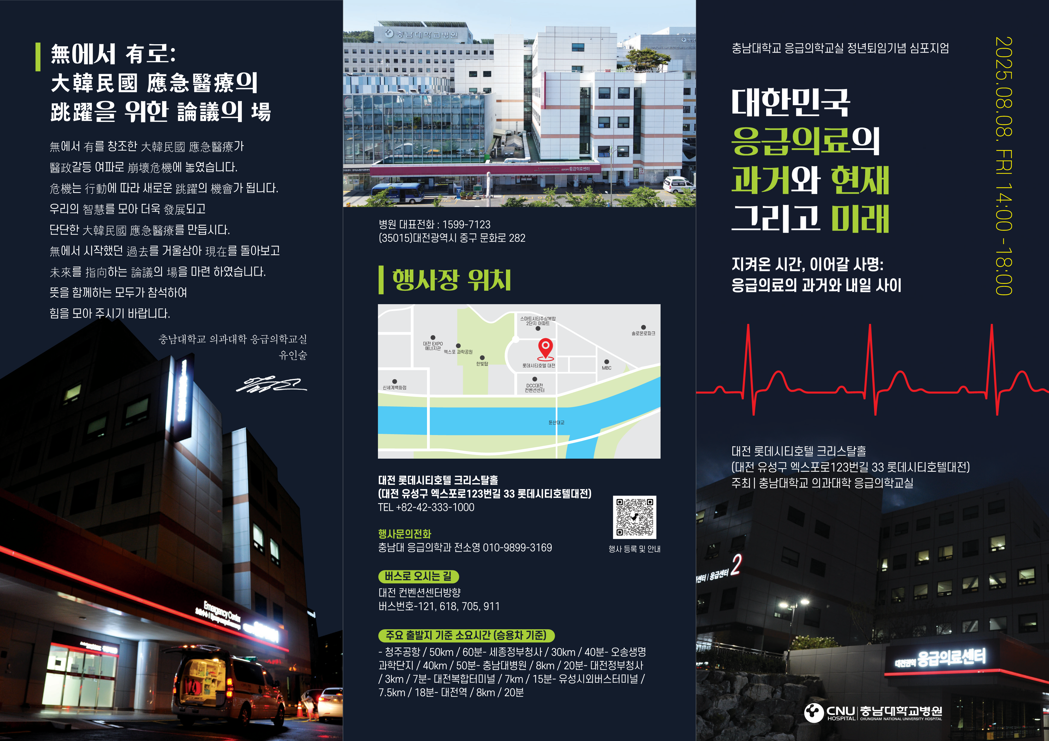 지역사회와 응급의료의 발전을 위해 헌신해 주시는 여러분의 노고에 깊은 존경과 감사를 표합니다. 저희 충남대학교 응급의학교실에서는 오는 2025년 8월 8일, 유인술 교수님의 정년을 기념하여 『대한민국 응급의료의 과거와 현재 그리고 미래』를 주제로 심포지엄을 개최하고자 합니다. 유인술 교수님께서는 우리나라 응급의료의 산증인으로서 반평생을 응급실 현장에 헌신해 오신 분입니다. 이번 심포지엄은 그간 교수님의 공로에 감사드리고, 대한민국 응급 의료의 발전 방향을 함께 모색하는 뜻깊은 자리가 될 것입니다.