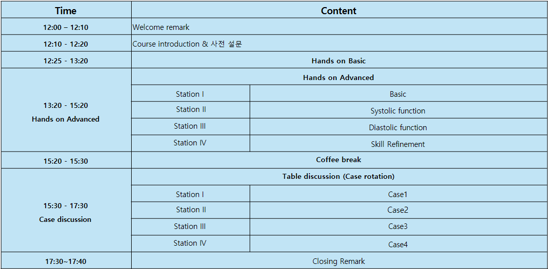 이번 워크샵에서는 실습 중심으로 진행되어, 참가자들이 각자 초음파를 시행하고 실습을 통해 심초음파 기술을 익히며, 실제 환자에게 적용할 수 있는 능력을 배양할 수 있습니다. 또한, 심초음파 기계의 최적 활용법과 심근의 수축기능 및 이완기능을 평가하는 방법을 배우고, 각자의 실습 시간을 충분히 가질 수 있도록 준비했습니다.