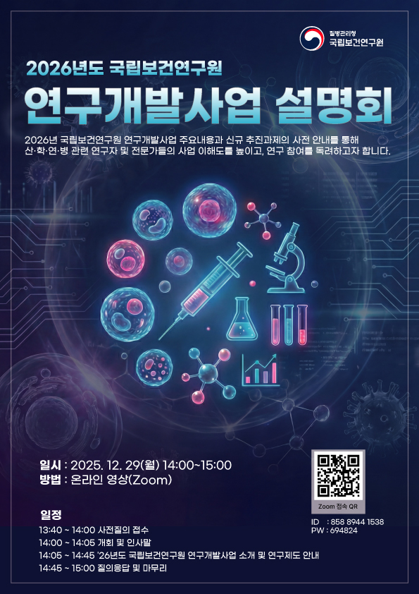 - 14:05 ~ 14:45 : 2026년도 국립보건연구원 연구개발 사업 소개 및 주요 연구제도 등 안내