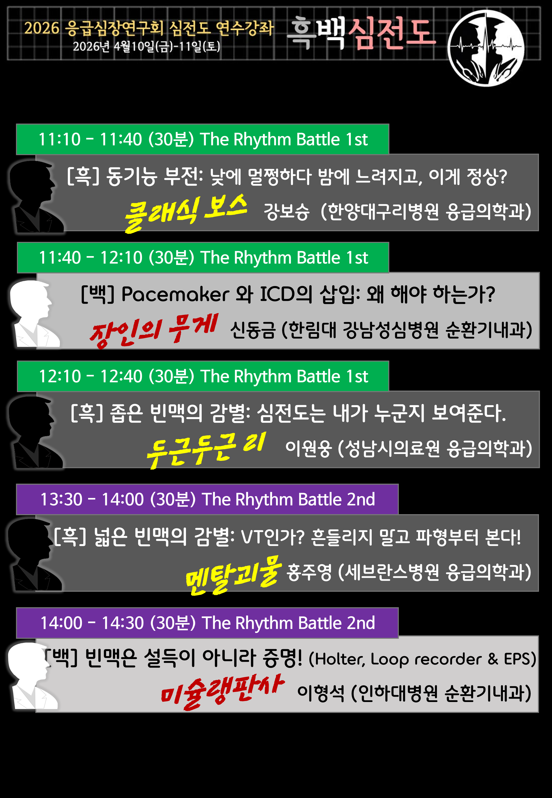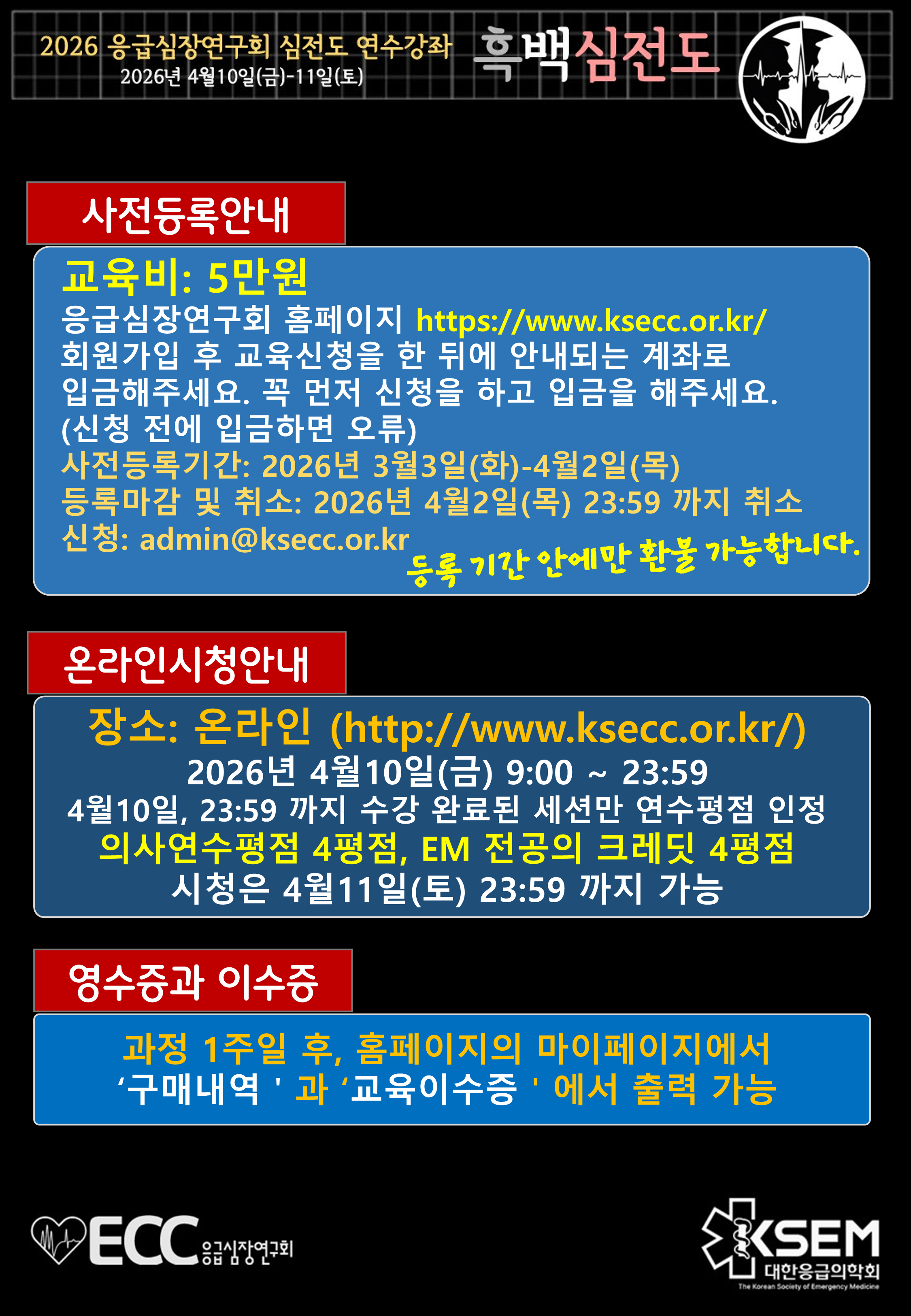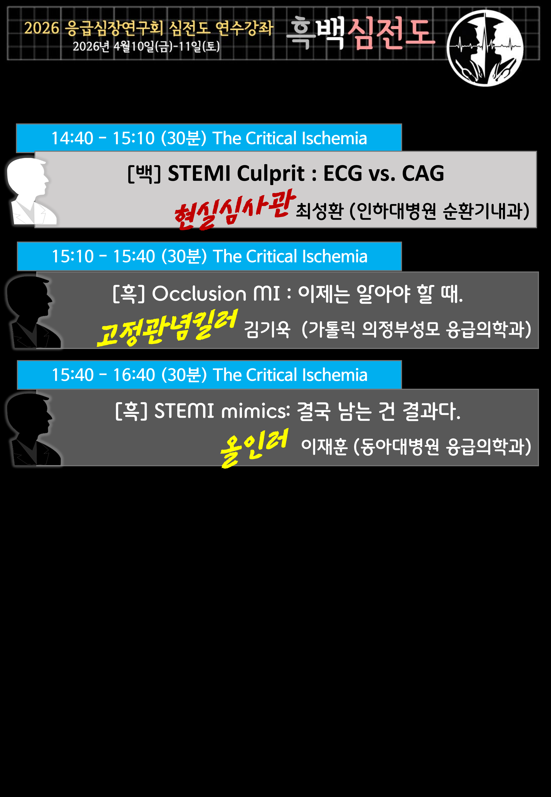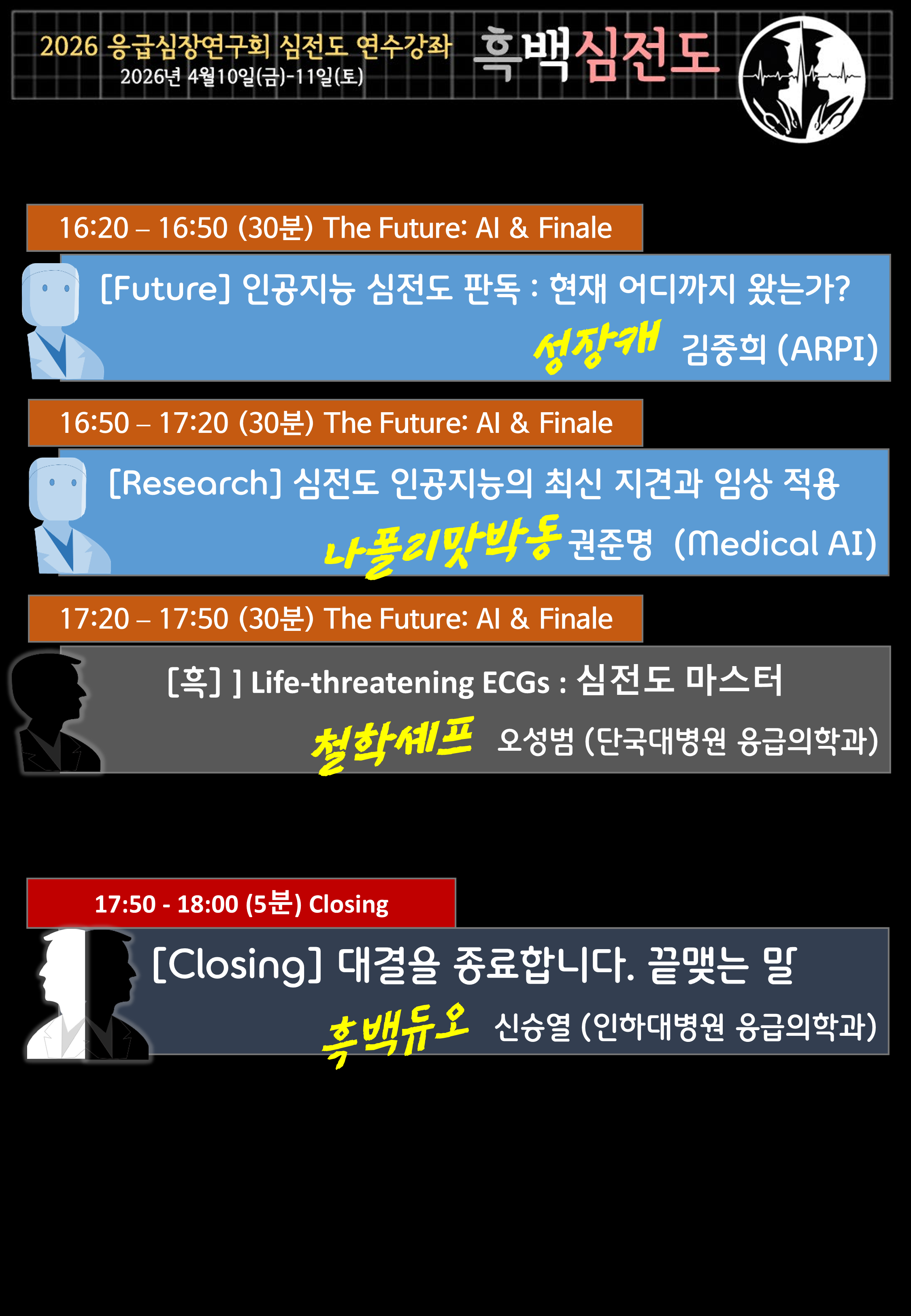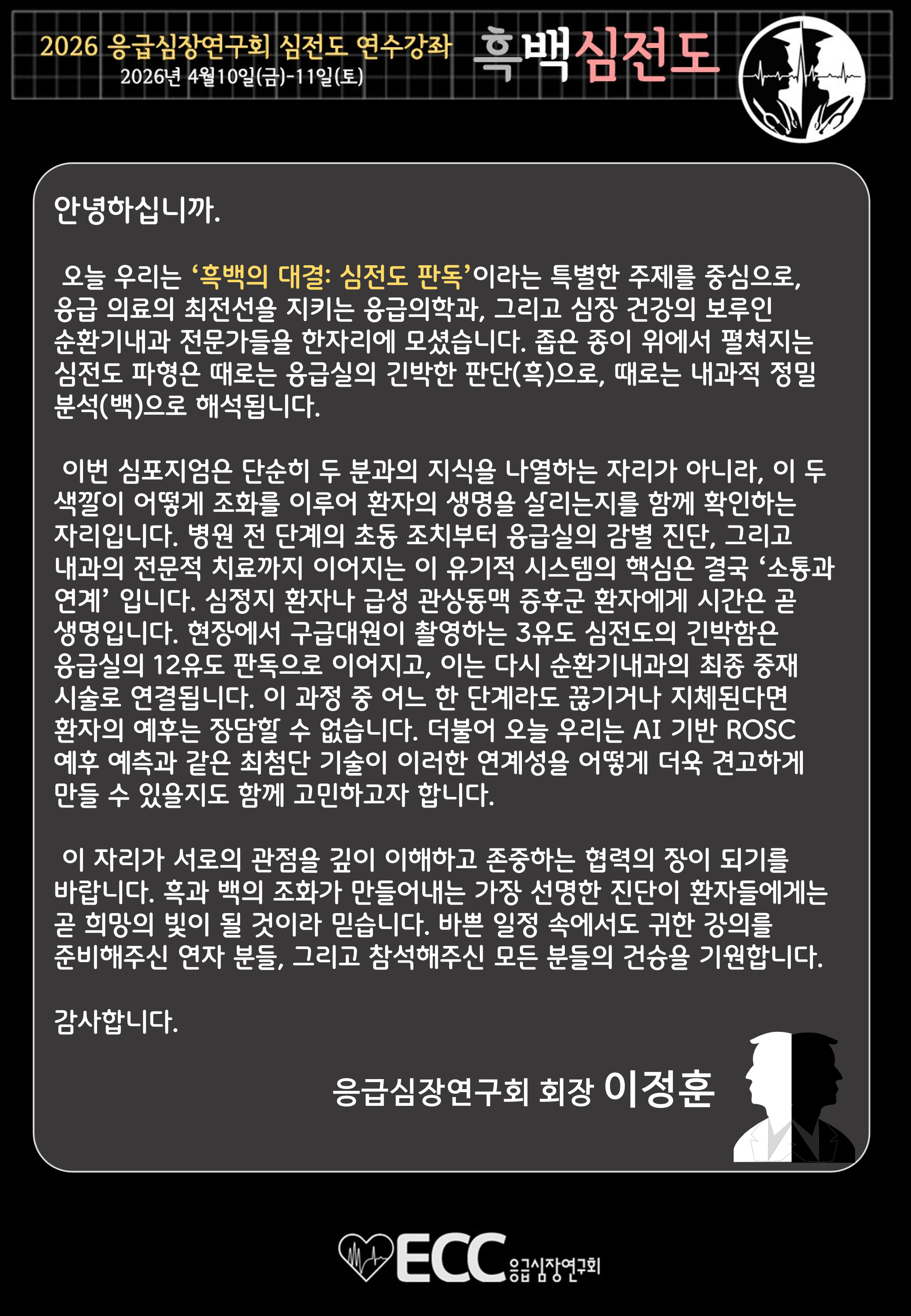 심전도라는 좁은 종이 위에서 펼쳐지는 파형의 움직임은 때로는 '응급실의 긴박한 진단(흑)'으로, 때로는 '내과적 정밀한 분석(백)'으로 해석되곤 합니다. 이번 심포지엄은 단순히 두 분과의 지식을 나열하는 자리가 아닙니다. 오늘 우리는 이 두 색깔이 어떻게 조화를 이루어 환자의 생명을 살리는지 확인하고자 합니다. 병원 전 단계의 초동 조치부터 응급실의 감별 진단, 그리고 내과의 전문적 치료까지 유기적인 시스템의 핵심은 결국 '소통과 연계'에 있습니다. 심정지 환자나 급성 관상동맥 증후군 환자에게 시간은 곧 생명입니다. 구급대원이 현장에서 찍는 3유도 심전도의 긴박함은 응급실의 12유도 판독으로 이어지고, 이는 다시 순환기내과의 최종적인 중재 시술로 연결됩니다. 이 과정 중 어느 한 곳이라도 끊기거나 지체된다면 환자의 예후는 보장될 수 없습니다.‘흑’과 ‘백’은 대립이 아닌, 보완의 관계입니다. 응급실에서 마주하는 찰나의 순간을 잡아내는 응급의학과의 통찰력과, 그 이면의 기전을 치밀하게 파헤치는 순환기내과의 전문성이 만날 때, 비로소 환자의 생명을 살리는 ‘완성된 진료’가 이루어집니다. 여기에 더해 오늘 우리는 AI 기반의 ROSC 예후 예측과 같은 최첨단 기술이 어떻게 우리의 연계성을 더욱 견고하게 만들 수 있을지도 함께 고민해보고자 합니다. 오늘 이 자리가 서로의 관점을 깊이 이해하고 존중하는 협력(Collaboration)의 장이 되기를 바랍니다. 흑백의 조화가 만들어내는 가장 선명한 진단이 환자들에게는 희망의 빛이 될 것이라 확신합니다.