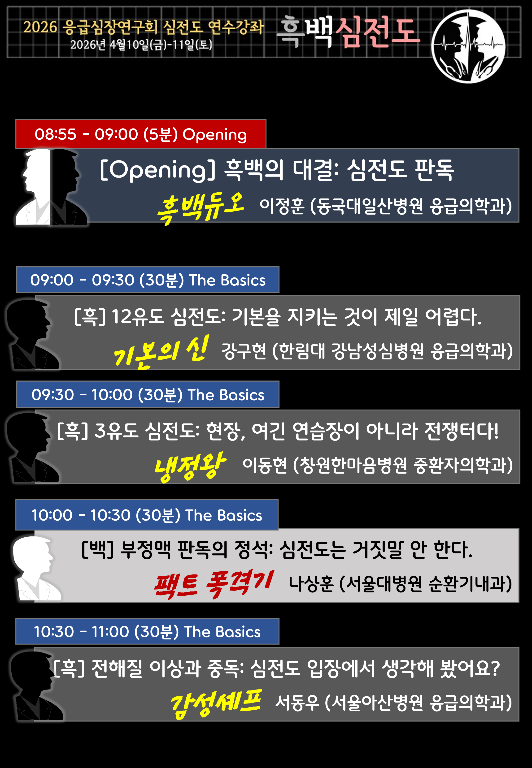 오늘 우리는 '흑백의 대결: 심전도 판독'이라는 특별한 주제 아래, 응급 의료의 최전선을 지키는 응급의학과와 심장 건강의 보루인 순환기내과의 전문가들을 한자리에 모셨습니다.